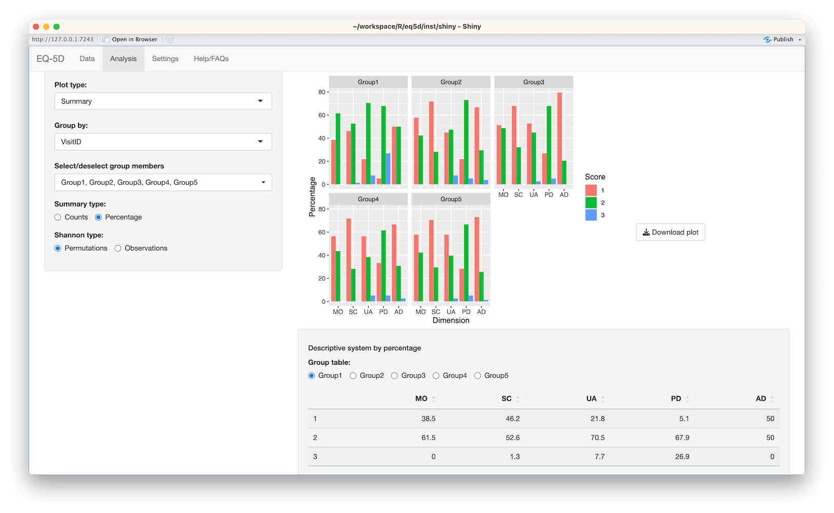 The eq5d package provides methods for the cross-sectional and longitudinal analysis of EQ-5D profiles and also the calculation of utility index scores from a subject’s dimension scores. Additionally, a Shiny app is included to enable the calculation, visualisation and automated statistical analysis of multiple EQ-5D index values via a web browser using EQ-5D dimension scores stored in CSV or Excel files.
